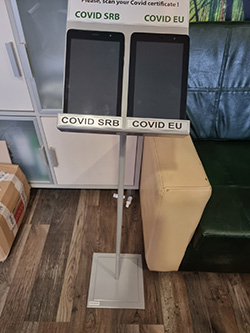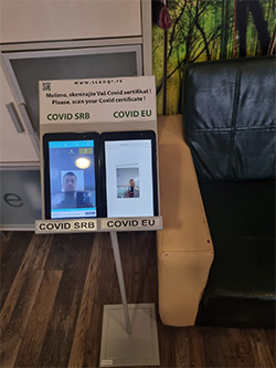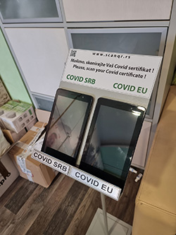 Scan QR resenje obuhvata jedno malo postolje sa dva tableta, softver za skeniranje SRB i EU sertifikata. Sistem je organizovan na estetski zadovoljavajucem postolju koje se montira na ulazu ili sredinu poslovnog objekta. Klijent samo prinosi svoj sertifikat na papiru ili mobilnom telefonu prema uredjajima. Napomnjijemo da ce veliki broj gostiju za praznike imati EU sertifikate koje nije moguce ocitati klasicnim telefonima sa kamerama.
